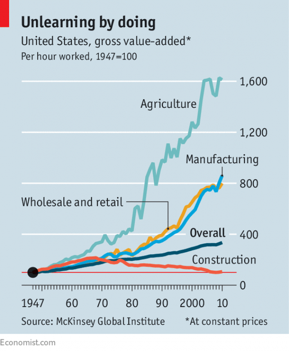 Unlike in manufacturing, where a single owner is incentivized to operate as efficiently as possible and invests in large capital expenditure projects that pay off over time, construction managers are motivated to turn around a single project as cost-effectively as possible while delivering to the architect’s specifications. They only work on a handful of projects each year, so they have a low willingness to experiment.