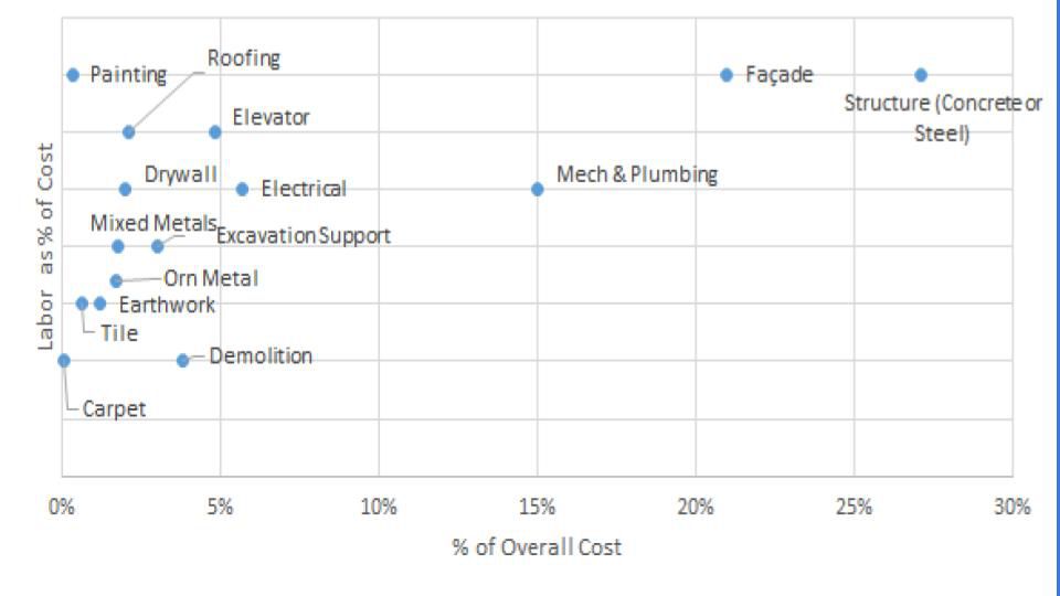 To understand the biggest opportunity for cost savings, I set out to understand what costs the most on a construction site. While this data is challenging to obtain and costs are extremely variable site-to-site, through conversations with contractors, I have seen some patterns emerge, which I plot in the accompanying graph. Costs tend to be held up in a few key verticals, and then widely distributed across most other tasks.