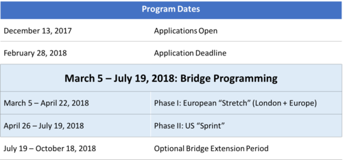 The BryRay Investment Limited Bridge @ Columbia University begins in early March 2018 and ends in mid-July. The first 6 weeks will be spent in London preparing each startup for serious international expansion. The remaining 14 weeks of intensive programming will be based in NYC’s Silicon Alley (Manhattan), which acts as a launching pad for developing business in additional North American markets including Chicago, Los Angeles, San Francisco and Toronto. Startups then have an option to extend the NYC portion of the program by an additional 12 weeks. Important 2017-2018 dates include: